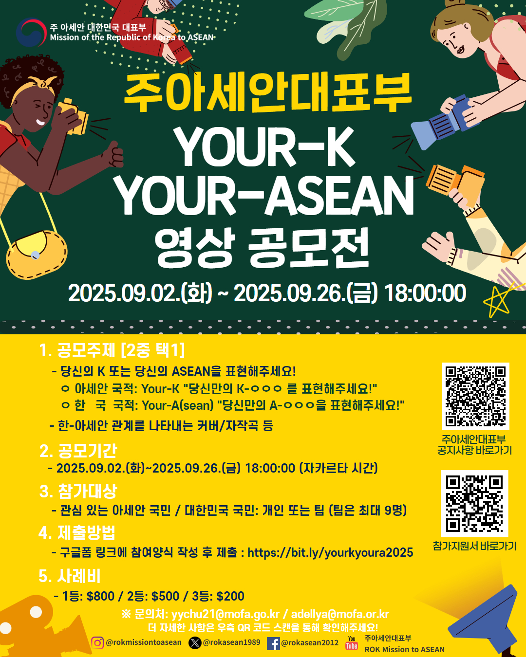 주아세안대표부는 2025년 YOUR-K, YOUR-ASEAN 콘텐츠 공모전 (영상)을 개최합니다.